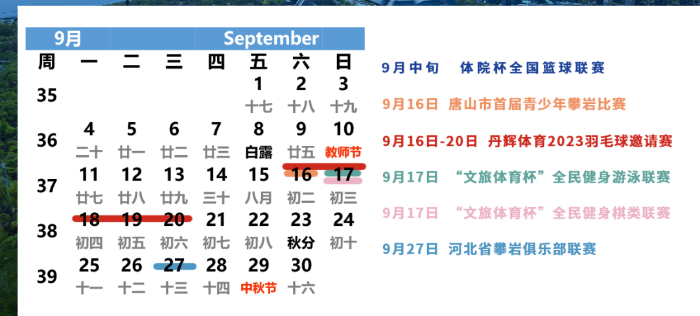 在陶瓷博览会和旅发大会期间体院杯全国篮球联赛,唐山市首届青少年攀岩比赛,丹辉体育2023羽毛球邀请赛,“文旅体育杯”全民健身游泳、棋类联赛,河北省攀岩俱乐部联赛将陆续举行。