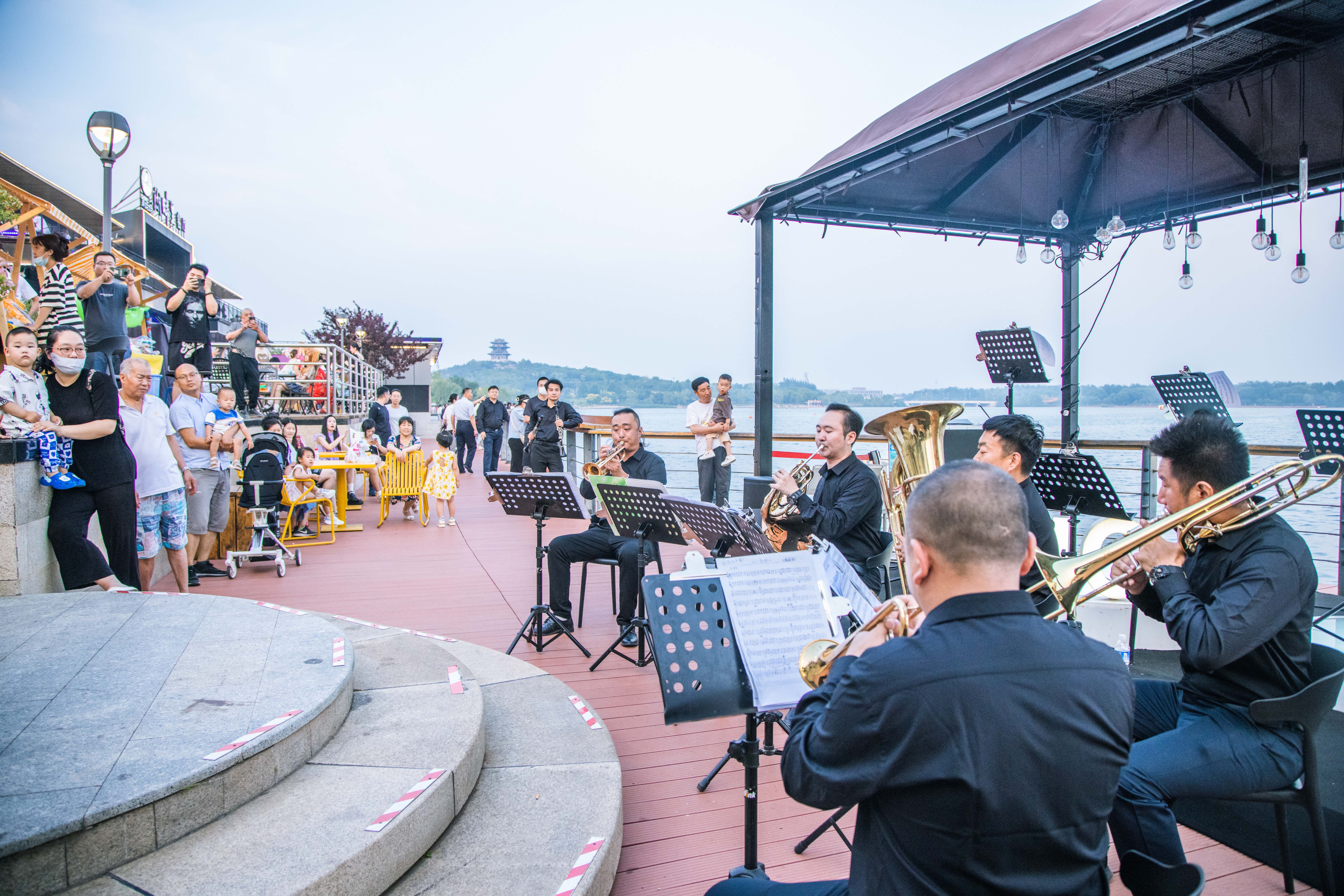 演奏家们在美丽的南湖景区幕天席地,通过管乐、木管五重奏、铜管五重奏等多种音乐表现形式,为游客献上了《我和我的祖国》《小城故事》《小序曲》《卡农》《在希望的田野上》等10余首深受观众喜爱的中外经典乐曲。美妙的音乐与南湖的夜色构成一幅诗意画卷,吸引诸多游客近距离驻足欣赏,众多音乐爱好者随音乐轻声哼唱,每曲完毕掌声四起,现场成为一片欢乐的海洋。