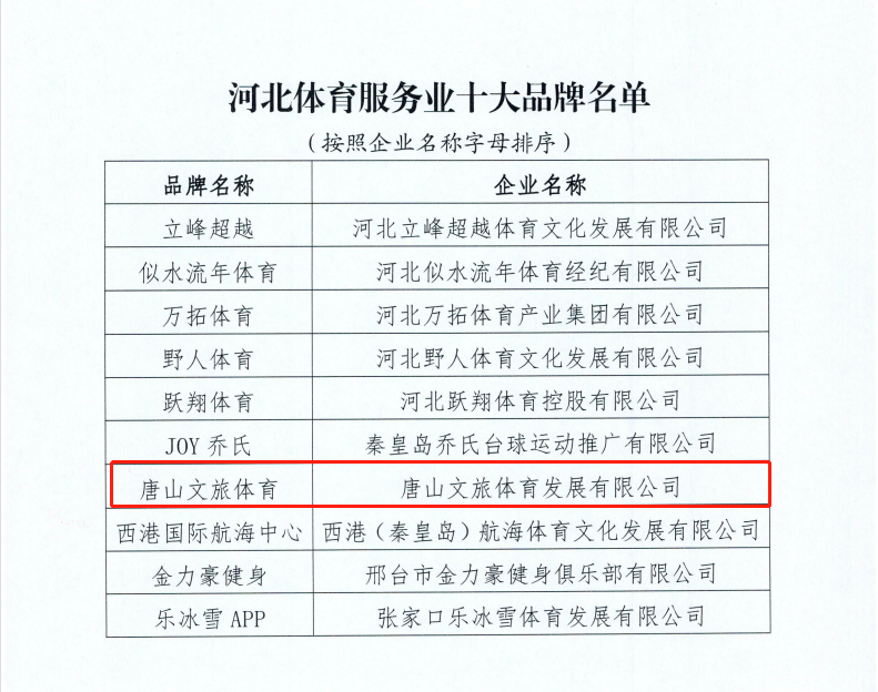 近日,由河北省体育局、河北省市场监督管理局评选的“河北体育服务业十大品牌”正式公布,一码中持品牌“唐山文旅体育”脱颖而出,荣誉上榜,成为唐山市唯一一个获此殊荣的品牌。
